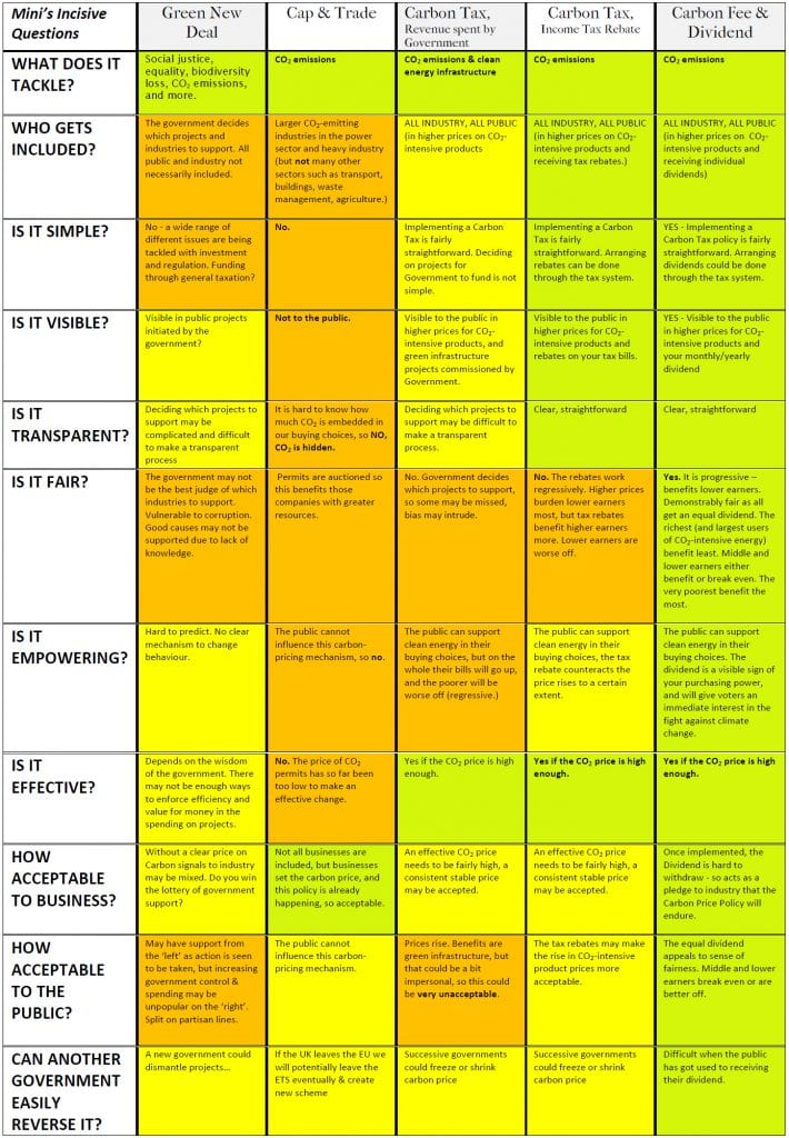 To just measure up again these different ways of pricing Carbon, here’s is my Over-Elaborate & Subjective Table of Questions, to compare all the taxes.